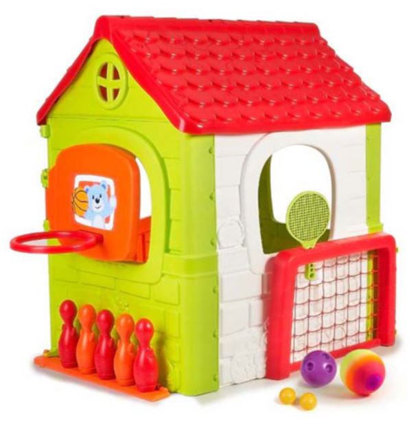 A casa inclui as seguintes atividades para as crianças brincarem: boliche, jogos de raquete, futebol, basquete (com cesto ajustável), alvo de bola de velcro e jogos de imitação com a própria casa, com acessórios incluídos. Essas atividades dobram-se na mesma casa e não ocupam espaço extra depois que o jogo termina.